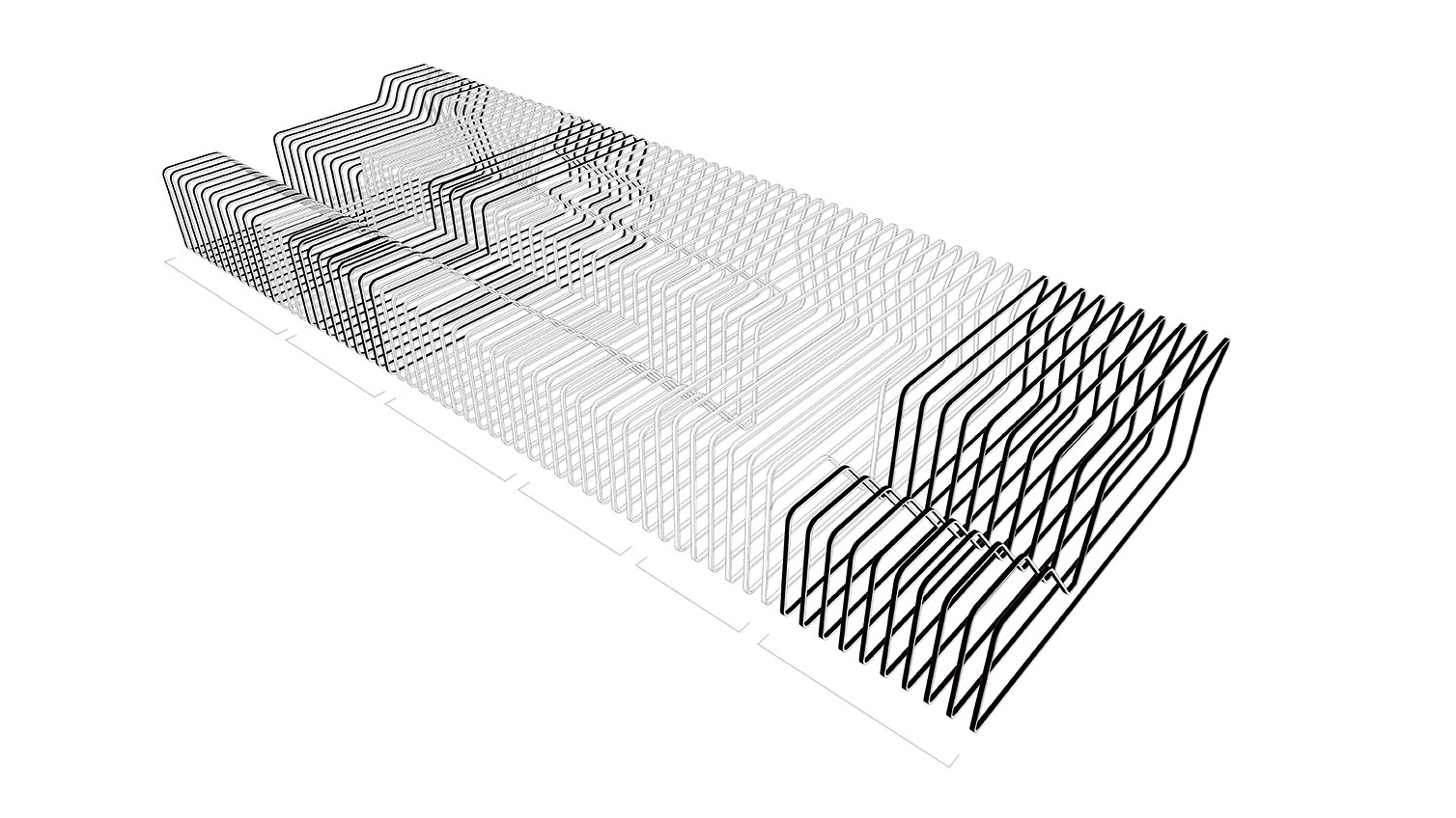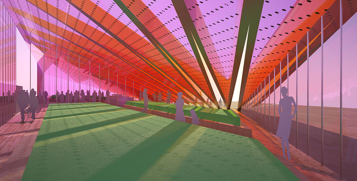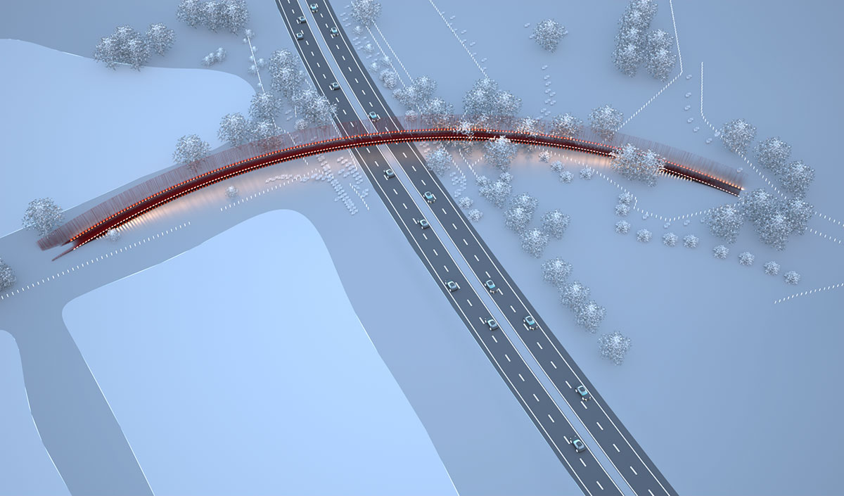 The Parkway Iconic Bridge is a formal gesture that resonates with familiar images of ribs, fins, and wings that gently move from the motions of its external surroundings caused by people, cars, wind, and horses. The pedestrian and horse bridge is designed as a composite of single profile steel sections attached to a super structure spine. This allows each fin to move independently like hair follicles flowing in the wind. The movement of the fins is not purely formal but rather an experiment to harvest energy from motion. Each fin is fitted with piezoelectric sensors to transfer motion into light. The gentle curve also acts as a visual layering system that serves to calm the horse by blocking a frontal view to the highway below.