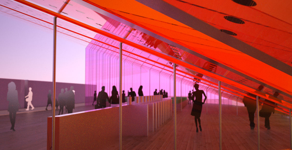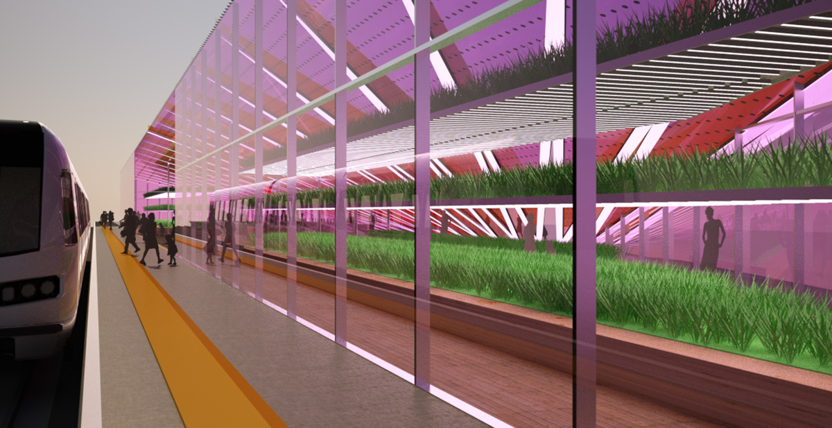 Hydroponic Station is an urban prototype for indoor farming. It is derived from combining the greenhouse with the train station. We imagine the experience of the everyday commuter traveling through a spectrum of colour while passing through a natural green environment and having the opportunity to nurture the plants before boarding their train. We want to enhance the quality of train travel. The expandable roof system captures maximum solar gain and produces enough electrical output for the hydroponic system requirements and lighting. Click to read more about our research with hydroponics.
