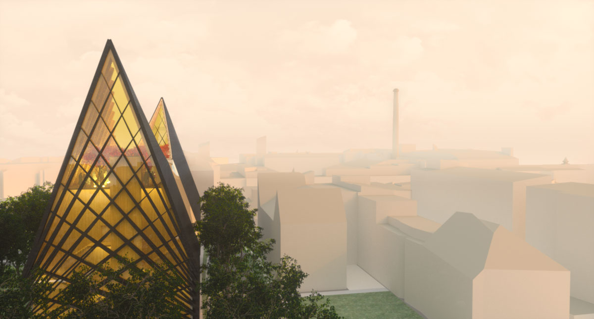 The formal concept of the building is inspired by fashion and art. The pleating fabric of charred wood drapes over the sides of a Finnish building and reaches above the city skyline as a visual beacon. Simultaneously the building respects the historical surroundings by maintaining a direct visual connection between the Palace, the park, and the city by lifting the skirted pleats to an all glass ground floor. In contrast to the dark exterior the homogeneity of sustainable material opens up to a warm all timber structure and interior. The jewel of the building is in the atrium where colours of glass refract through out the bridges and foyer below creating an ambiance. The pleats are functional as they materialize into louvers angled to block out any direct light allowing views downward into the park keeping the visual connection with the site. Our challenge was to create a sustainable aesthetic design by creating a complete CLT timber building with innovative heated glass.
