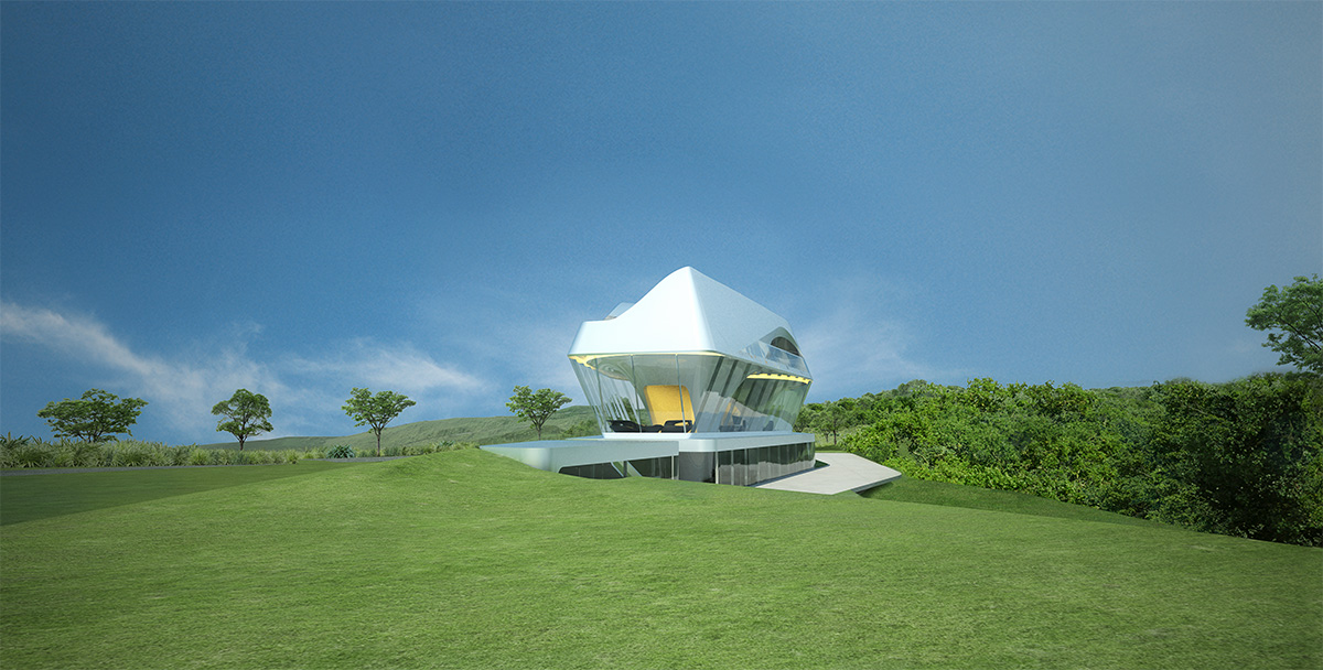 The Symbiotic Villa stands amongst lush vegetation in northern Taipei and derives its fluid form from a distinctive roof line. This structure emerges naturally from the supporting topography through a series of geometric cones creating a harmonic tension between built form and environment which echoes the Chinese philosophy of Ying and Yang.