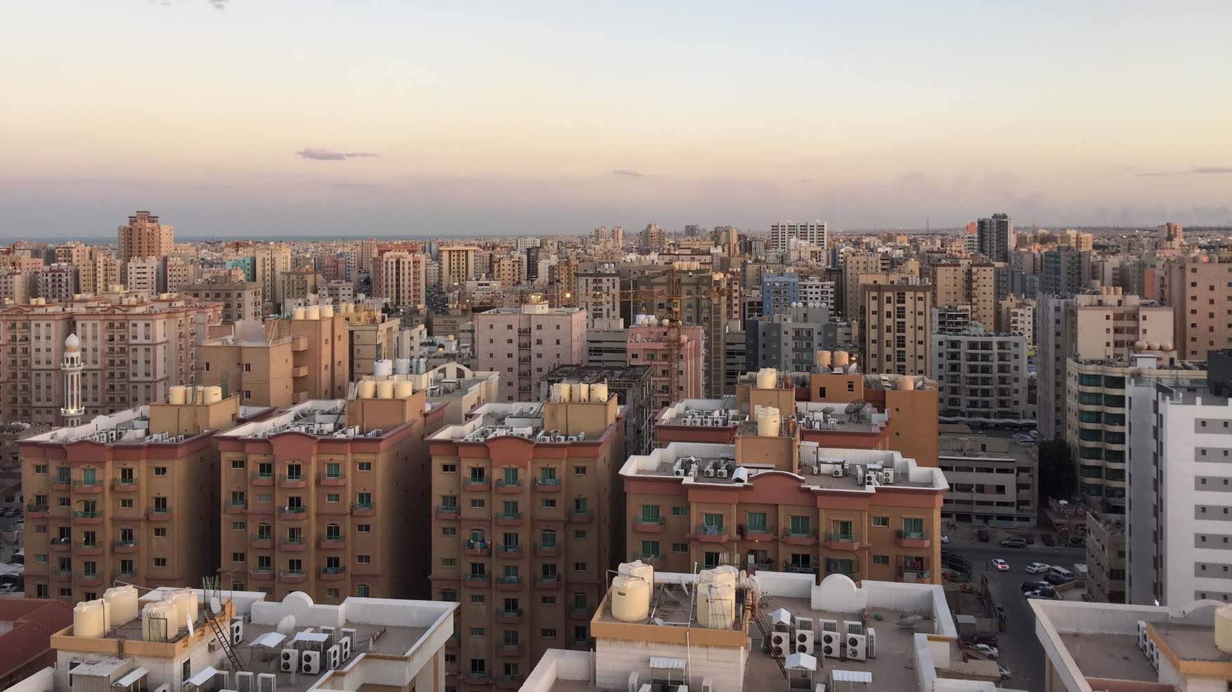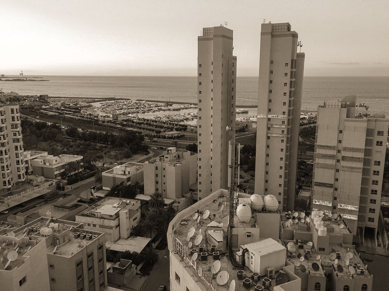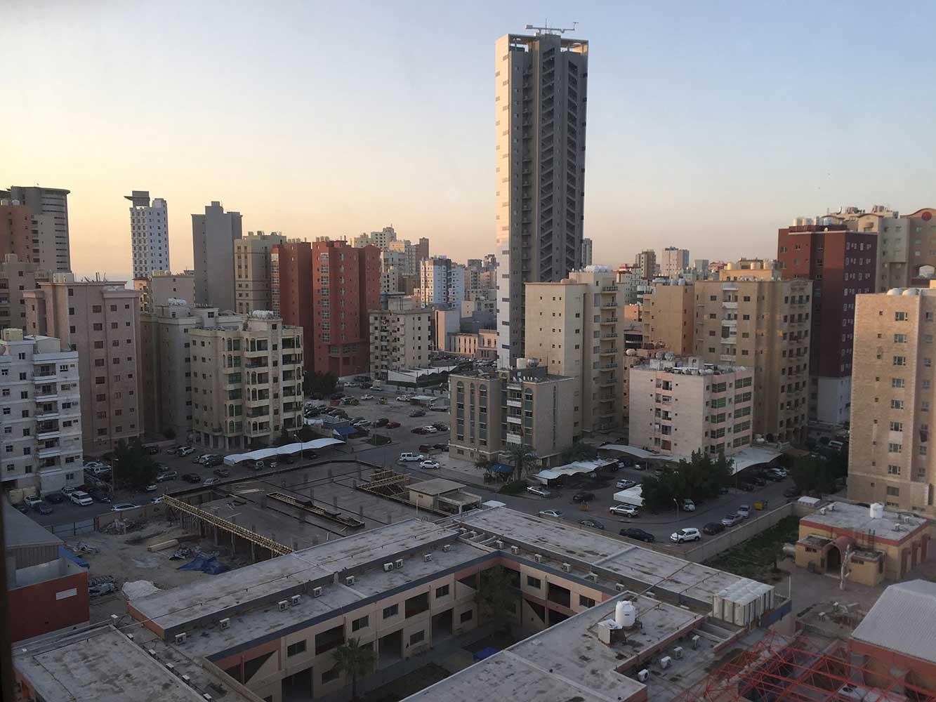 Fifteen floors above Al Slamiya, water tanks rest upon rooftops while satellite dishes capture images from abroad. Gazing out into the horizon of the Persian Gulf I squint my eyes imagining faint twinkling lights on lands opposite the wider parts of the sea. The Arabian Gulf Road is in a deadlock of cars and the aroma of grilled meat rises in the hot air to the floors above.